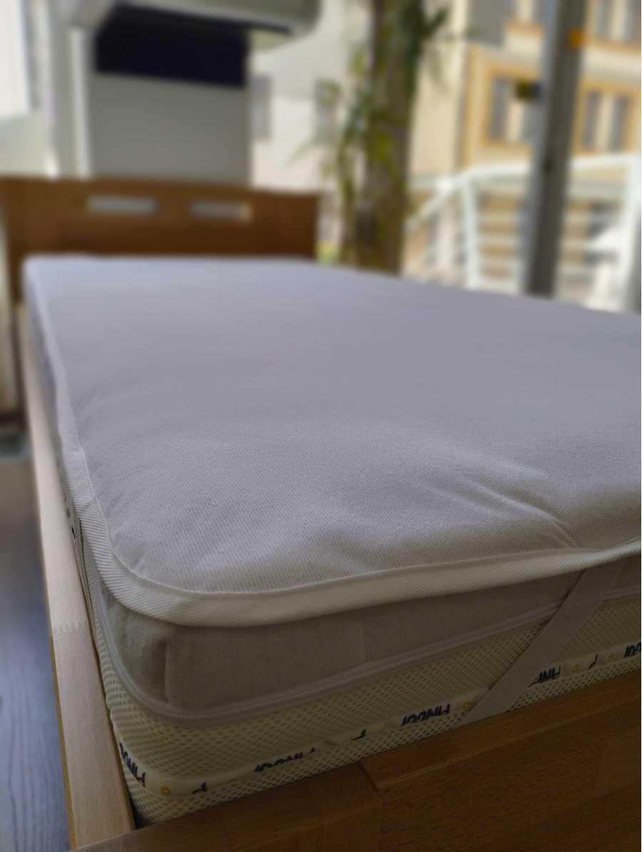 Antibakteriálny nepremokavý froté chránič matraca, šijeme z moderného dvojvrstvového froté materiálu s hustotou 110gr/m2. Nepriepustnú časť chrániča tvorí vrstva s nepremokavou membránou, ktorá je na spodnej strane chrániča, dvojvrstvový froté materiál tvorí vrchnú časť chrániča. Chránič sa dáva navrch matraca, po rohoch ma napínacie pásy a upne sa o roh matraca a je na pevno, nešmýka sa po povrchu matraca. Froté chránič matraca je nepriepustný, vďaka čomu udržuje matrac v suchu a čistote. Ide o jednoduché a elegantné riešenie ochrany matracov. Ochráni pred tekutinami a nebráni matracu prirodzene dýchať.